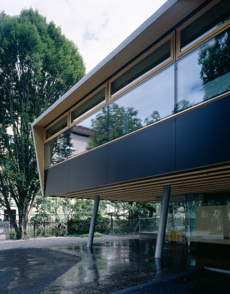 Die Südseite ist durch ein 4 m weit ausladendes Vordach komplett wettergeschützt und ermöglicht das Spielen im Freien auch bei Regen. Dieses Vordach beschattet die zweigeschossige, durchgehend verglaste Fassade im Sommer, lässt aber für eine positive Energiebilanz die tief stehende Wintersonne nach innen dringen.