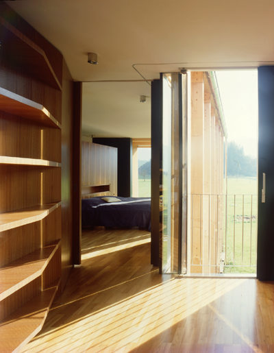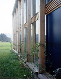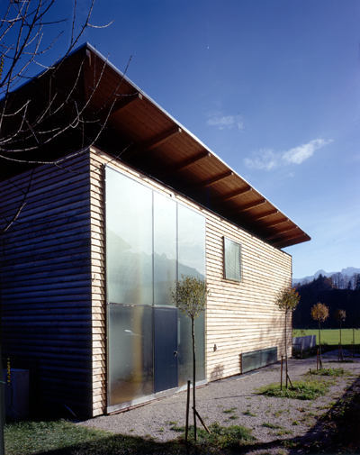 Die perfekte Oberfläche der Glasflächen kontrastiert mit dem rohen, fast ruppigen Erscheinungsbild des organischen (und somit alterungsfähigen) Baustoffes Holz.