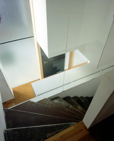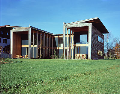 Zwei Schenkel des U-förmig angelegten Gebäudes umfangen ein nach Süden geöffnetes Atrium, während das Haus der nördlichen Himmelsrichtung ostentativ den Rücken zukehrt. (Text: Gabriele Kaiser, 19.04. 2003)