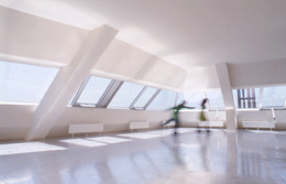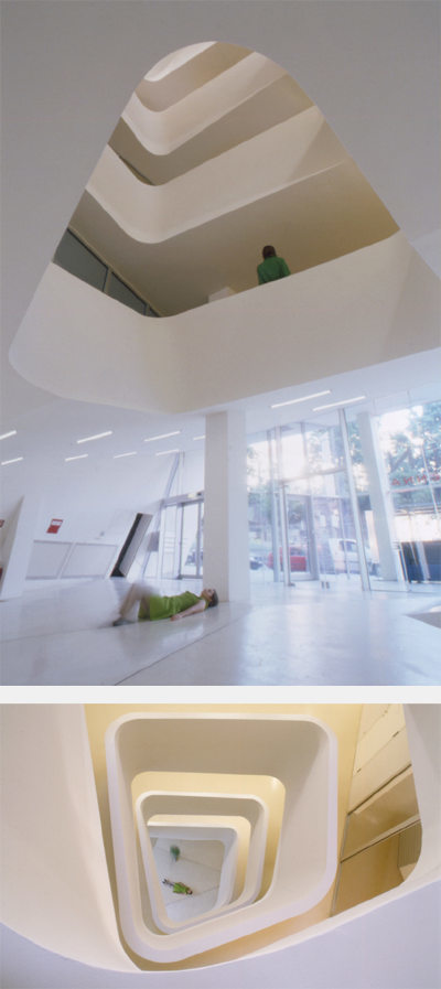 Das Foyer ist als weitläufige, gefaltete Landschaft in Cremeweiß gestaltet. Außen und Innen gehen geschmeidig ineinander über. Ein gläserner, voll ausgestatteter Seminarraum steht allen Mietern zur Verfügung. Die weißen Faltungen setzen sich in den dahinter liegenden Hof fort, dessen weißer Holzrostbelag über die Wand samt integrierter Sitzbank hochgezogen wird. Repräsentativ und luftig wirkt die ganze Eingangsebene und lässt die verkehrsumtoste, staubige Stadtautobahn vor der Tür sofort vergessen.