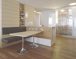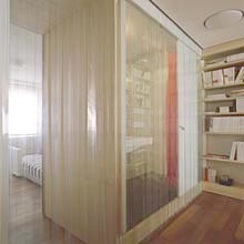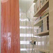 Das Badezimmer wurde durch eine gläserne Sanitärbox ersetzt, in deren Aussen-Konstruktion ein Bücherregal integriert ist. Eine Bücherwand überzieht auch die Längswand des offenen Wohn-Essbereiches, der nur durch einen lichtdurchlässigen Vorhang aus Folienstreifen von den beiden Rückzugsräumen getrennt ist. Die Fläche des einstigen Vorzimmers geht schwellenlos in den Wohnraum über, membranhaft zarte Trennelemente bestimmen anstelle von Wänden die Syntax der Funktionsbereiche. Homogenisierende Massnahmen wie ein Dielenboden aus Akazienholz, ein logisches Stauraumkonzept und die „klärende“ Möblierung haben eine unspezifische Gemeindebauwohnung für gegenwärtige und absehbare Nutzungen gerüstet. (Gabriele Kaiser nach einem Text der Architekten, 19.06.2003)
