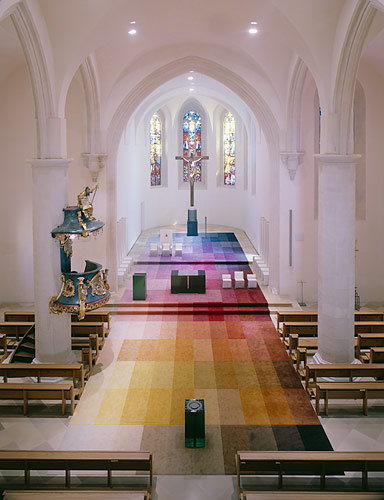 Das Hauptaugenmerk der bodenarchitektonischen Erneuerung liegt auf dem Übergangsbereich zwischen Hauptraum und Apsis: Die vorderen inneren Bankreichen wurden durch eine flexible Bestuhlung ersetzt, die mit den Proportionen der Apsis korrespondiert. Dieser in den Grundriss eingeschriebene, apsisintegrierende kleinere Längsraum ist durch einen färbigen Teppichbelag vom restlichen Domboden deutlich unterschieden. Der in den Farbnuancen mit den Glasbildern und Steinoberflächen der Kirche abgestimmte niederflorige Teppich ritualisiert die Annäherung vom Hauptschiff zum Altarbereich im geräuschlosen Gehen auf färbigem Grund; hinter dem Tabernakel kommt wieder der Steinboden zum Vorschein. Der künstlerische Entwurf für den Teppich stammt von Gilbert Bretterbauer, liturgische Möbel von Brigitte Kowanz bereichern die strukturelle Auffrischung des Doms durch subtile zeitgenössische Setzung. (Text: Gabriele Kaiser)