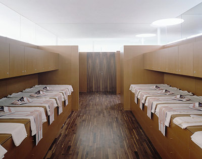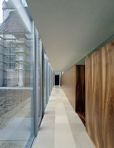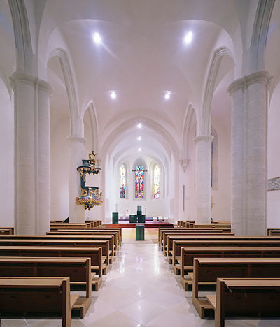 Ein homogene Fläche aus sandsteinfarbigem Beton entlang der Bischofskirche nimmt auf deren Massstäblichkeit und Materialität Bezug und setzt einen spürbaren Kontrapunkt zum Grauton der umgebenden Bebauung. Dieser „Teppich“ gibt der Kirche und der städtebaulichen Anknüpfungspunkte eine aussenräumliche Fassung, die sich im sakralen Innenraum mit den geschliffenen Natursteinplatten auf verfeinerte Weise fortsetzt. Im Hauptraum wurde der Boden angehoben, um eine schwellenlose Verbindung zwischen Innen und Aussen zu schaffen, eine homogenisierende Massnahme, die sich auch in Plattenstruktur und Fugenbild abzeichnet. Durch die Anhebung des Bodens entstand ein Hohlraum, der für die Luftführung der Heizung mit temperierter Quellluft genutzt werden konnte. Die niemals mangelnde Kühle des hohen Kirchenraums dient im Sommer zur Klimatisierung der Sakristei.