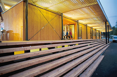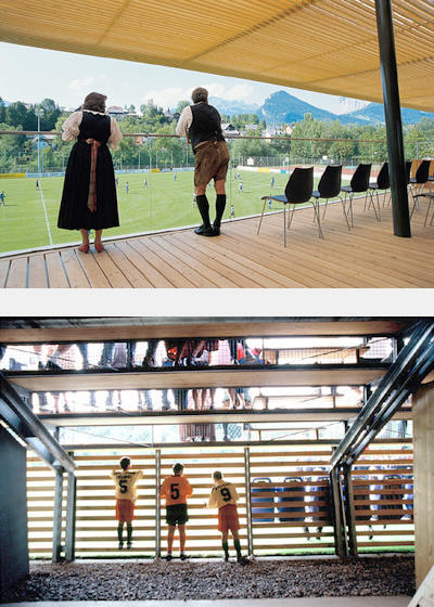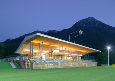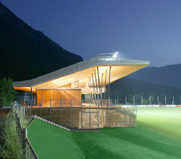 Über dem Basisgeschoss für die Sportler (tragende Wandschoten und Decke in Stahlbeton) reihen sich in einem autonomen, unter das Dach „geschobenen“ Baukörper (Wände und Dach in Holzsystembauweise) die Funktionen Büro, Veranstaltung, Buffet – Abstand – WC. Der VIP-Bereich ist zuoberst situiert, als mittige Box durchstösst er das Dach und bietet naturgemäss beste Sicht auf sportliches Geschehen. (Text: Gabriele Kaiser)