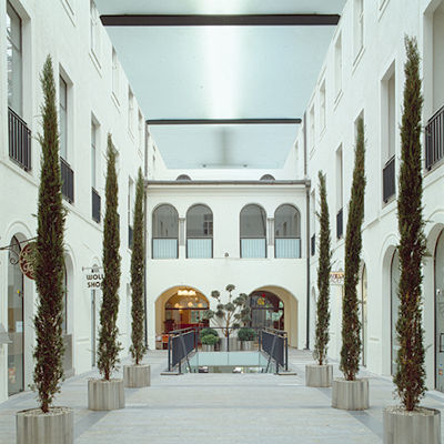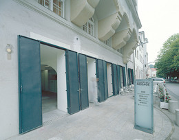 Die prägende Oberfläche des Milchglases tritt in allen Bereichen der Passage in Erscheinung, selbst die Beschriftungsstelen vor den Geschäftseingängen sind aus diesem Material gefertigt. Milchglas als „flüssiges Element“ und gestalterisches Leitmotiv bestimmt die luzide Grundstimmung des Durchgangs, als behutsame Ergänzung des restaurierten Altbaus wirkt es identitätsstiftend, ohne vorhandene Strukturen visuell zu „überschwemmen“. (Text: Gabriele Kaiser)