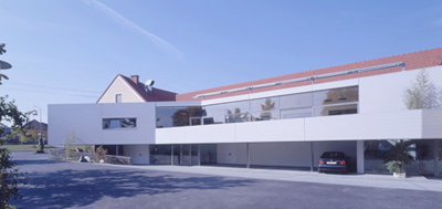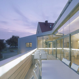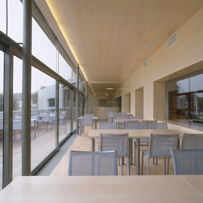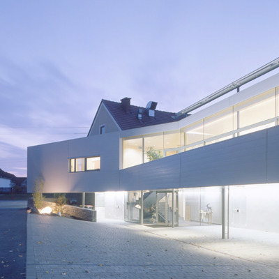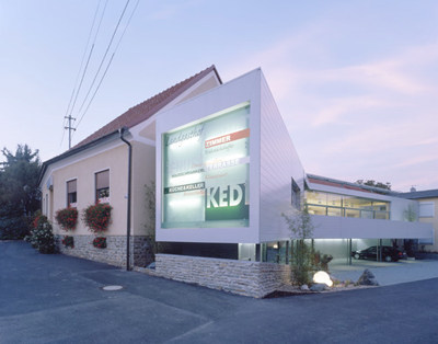 Der schlanke neue Gebäudeflügel (Assoziationen an Tragflächen seien gestattet) ist vor die bestehenden Gasträume gesetzt, am Gelenkpunkt der Rezeption öffnet sich der Raum zum Trapez mit Erschließung und erweitertem Küchenbereich. Die Dehnbewegung des Raums von der schmalen Sequenz der Restauranttische hin zur Rezeption kommt in einer bügelförmigen, Alt- und Neubau übergreifenden Theke zum Ausdruck, die diesem Schwellenbereich zwischen unterschiedlichen Funktionen eine klar erkennbare Identität verleiht. Transparenz und Durchlässigkeit sowie die strukturelle Verschränkung von unterschiedlichen Raumeinheiten sind in der Architektur von Pichler & Traupmann immer wieder ein spannendes Thema, und im vorliegenden Beispiel gelingt diese offene Verknüpfung auf augenscheinliche wie beiläufig selbstverständliche Weise. (Text: Gabriele Kaiser, 03.09.2003)