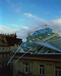 Obwohl sich die Architektur allen Gesetzen der Schwerkraft zu entziehen scheint, liefert sie soweit sie sich in logisch erkennbaren Zusammenhängen deklariert, aufregende Punkte: etwa die Knoten der Aufhängung der alten Holzgespärre in den Büroräumen oder das den Diagonalbogen begleitende System von transparenten und geschlossenen, den Raum durcheilenden Flächen. Der Dachaufbau ist insofern auch eine „Architektur des Ortes“, als diese die luftige Situation über der Traufe eines Ringstraßenhauses zur Wirkung bringt und nicht nur ein Innenraumerlebnis, sondern auch ein neues Stadtraumerlebnis vermittelt.