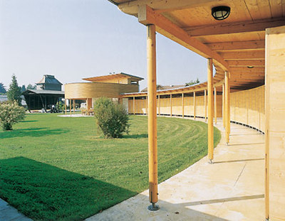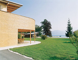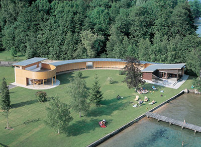 Das westseitige Ende des Bogens bildet ein zweigeschossiger, halbrunder Bauteil mit Sanitäreinheiten und gedecktem Freiplatz im Erdgeschoss sowie Sauna mit Sonnenterrasse darüber. Ostseitig begrenzt ein bestehendes, altes Badehaus die Anlage. Die Reduzierung auf wenige Materialien ergibt ein großzügiges, geschlossenes Gesamtbild der Anlage.