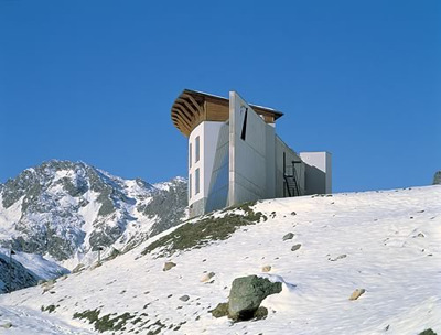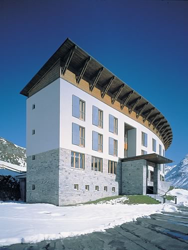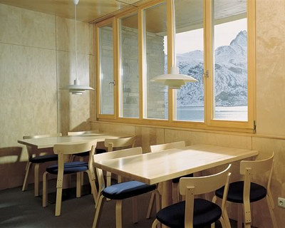 Eine großzügige Kaskadentreppe erschließt die drei Hotelgeschoße, der großzügige Vertikalraum, die die Geschoße zusammenbindet, schafft eine integrierende Atmosphäre, wie sie für Schutzbauten im Alpenraum typisch ist. Der hölzerne Dachaufbau erinnert an Hotelbauten aus den dreißiger Jahren, doch das sich mit der rückseitigen Schutzwand verschneidende riesige Panel mit Sonnenkollektoren verweist auf unsere Zeit.