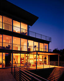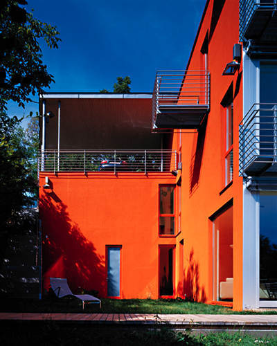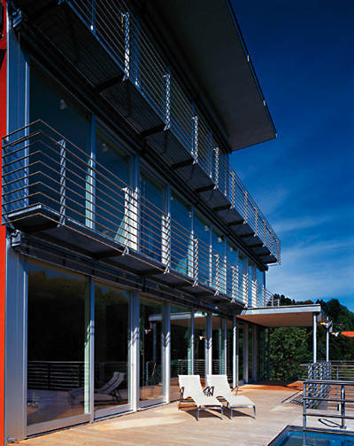 Den Wohnräumen im Erdgeschoss wird ohne Niveauunterschied eine Plattform, gedeckt mit Teakholz vorgelagert. In diese Plattform eingelassen ist ein Swimming-Pool, welches an seiner Vorderkante 4.5 m über dem anschließendem Terrain schwebt.