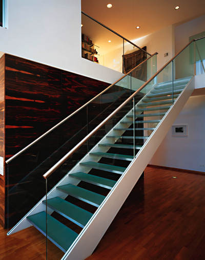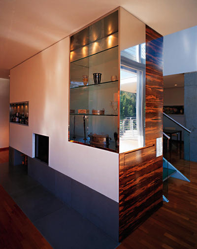 Das Wohnhaus wird durch einen nur 4.90 m breiten Streifen zur Straße über einen Baldachin mit Carport erschlossen. Vom Eingang, gleichzeitig höchster Punkt des Hauses - 2. Obergeschoss, führt zuerst ein Treppe parallel zum Hang in das 1. Obergeschoss. Von hier bietet sich erstmals im Haus der spektakuläre Ausblick über die zweigeschossige Galerieverglasung und Bibliotheksgalerie. Eine gläserne Treppe in der Fallinie des Hanges verbindet diesen „Platz“ mit dem freien Grundriss des Erdgeschosses.