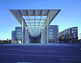 In der letzten Stufe des Wettbewerbs waren es schließlich zwei Projekte, zwischen denen die Entscheidung fallen sollte: ein monumentaler Solitärbau von Wilhelm Holzbauer, 24 Stockwerke hoch die Büroetagen, daran angelagert im Oval die Kulturbauten; und eine flächige Stadtreproduktion von Ernst Hoffmann, im Geist der metaphernfreudigen achtziger Jahre zusammengesetzt aus Boulevard und Passage, Anger und Platz. Holzbauers Projekt hätte eigentlich nie so weit kommen dürfen, denn bei aller Symbolkräftigkeit sagte es vor allem eines: Ich bin wichtig! Von Bürgernähe war da nichts zu spüren, und die Idee, den Landtagssaal in einer hermetisch abgeschlossenen Kugel unterzubringen, war bestenfalls ein bitterer Scherz über den Wunsch des Auslobers, politische Offenheit sichtbar zu machen.