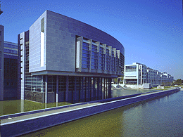 Ernst Hoffmann hat sich jede Mühe gegeben, dieses Urteil zu widerlegen. Aber gerade das hat dem Projekt nicht gutgetan. Statt zu einer präzisen und zurückhaltenden Sprache zu finden, pendelt die Architektur unentschlossen zwischen modernistischen Figuren und postmoderner Kraftmeierei. Die Fassaden der Verwaltungsbauten, ursprünglich als leichte Glasfassaden in einem tragenden Skelett angedeutet, bekamen ein Rahmenmotiv aus Kunststein vorgesetzt, das ihnen eine unnötige Schwere verleiht. Der Landtagssaal selbst, in der Terminologie der Planer gerne als „schwebendes Schiff“ bezeichnet, erweist sich in natura als hohle Geste, deren dynamischer Schwung vollkommen ins Leere läuft. Was das Innere dieses Bauwerks mit seinem Äußeren zu tun hat, bleibt unklar, und sein statisches Konzept der Auskragung - eine sehr, sehr dicke Betonplatte auf runden Stützen - ist alles andere als innovativ.