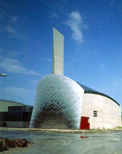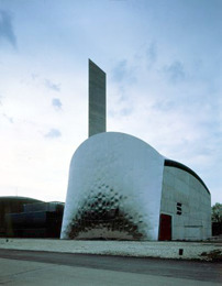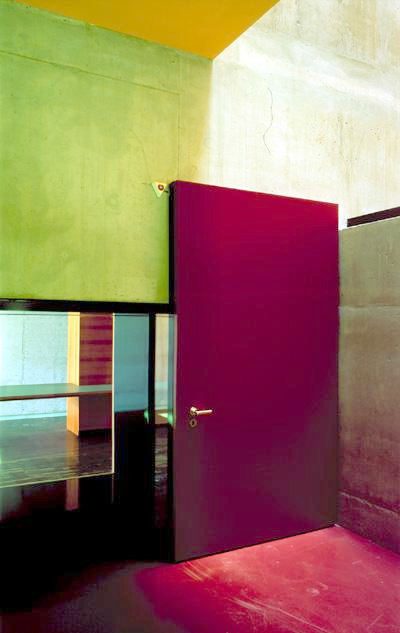 Im Grundriß überwiegt die Orthogonalität. Die Längswände mit den kleinen Lisenen und die am Rande gefalteten Transversalen sind gegen jedwelche Kraftein-wirkungen unempfindlich. Die einzige Öffnung, ein Bandfenster, läßt die möglichen inneren Ebenen des Gebäudes durchscheinen.