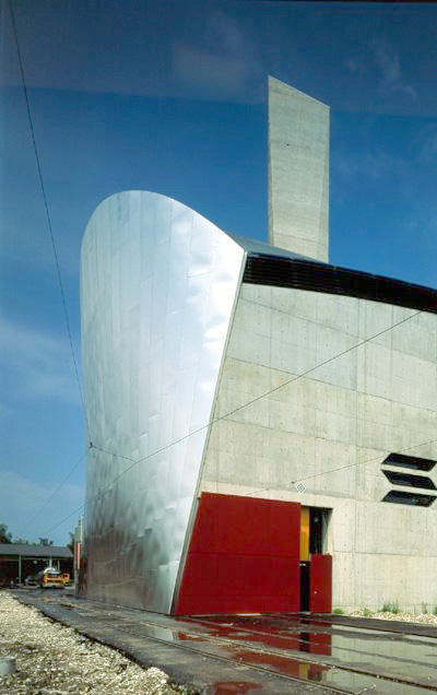 Die Situierung des Gebäudes ist bestimmt durch die Eisenbahnschienen, an denen sich verschiedene Baukörper anreihen. Auch der hohe Kamin, der erhöht und neu verkleidet wurde, um einen zusätzlichen Rauchfang aufzunehmen, orientiert sich an den Bahngleisen. Dennoch, die im Grundriß so kompakt erscheinenden Körper der Anlage verzerren sich im Aufriß.