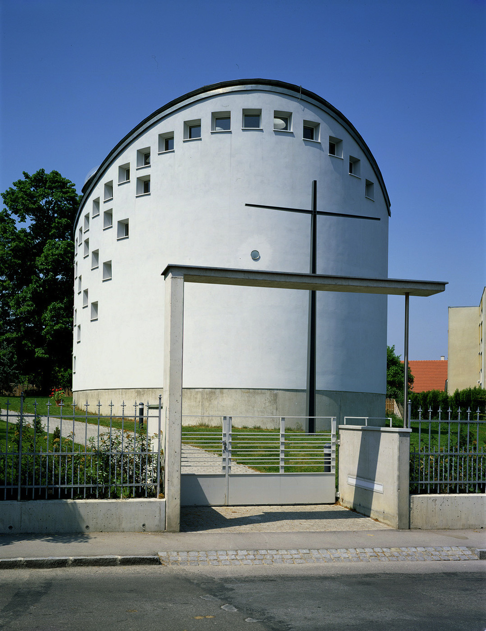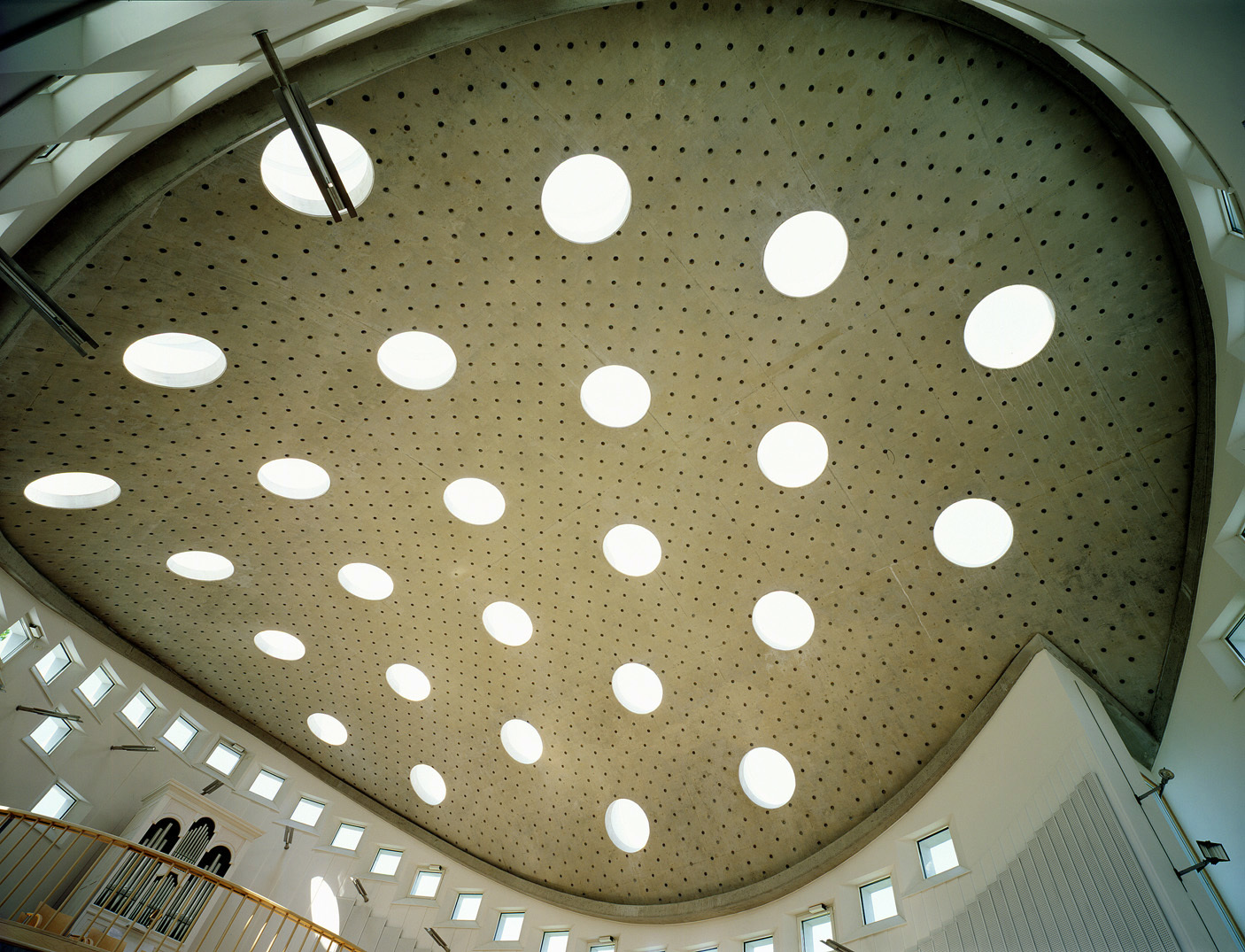 Eine kleine kreisrunde Öffnung in der Apsiswand verweist auf die exakte Ost-Westausrichtung des 160 Personen fassenden Versammlungsraums, zusätzlich fällt über einen hohen Spalt in der Apsiswand seitlich Tageslicht in den Raum. Das Deckengewölbe mit 25 kreisrunden Lichtkuppeln ist als Himmel interpretiert, der den bestuhlten Gemeindebereich sowie den um eine Stufe erhöhten Altarbereich mit Kanzel und Taufbecken überspannt. Die Garderobe und eine kleine Sakristei sowie ein Abstellraum als Sesseldepot sind im westlichen Eingangstrakt untergebracht, dessen Dach im Unterschied zum mit Titanzinblech gedeckten „Himmel“ mit Moos begrünt wurde. (Text: Gabriele Kaiser)