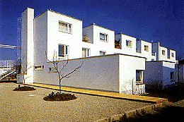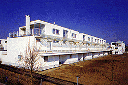 Die Siedlung besteht aus drei Bauteilen, unterteilt in sechs Häuser, mit insgesamt 31 Wohnungen, - Variatio-nen von drei verschiedenen Maisonettentypen. Diese besitzen entweder Gärten oder große Dachterrassen und nach Osten gerichtete Lauben. Gehwege, im Erdgeschoss überdacht, im Obergeschoss terrassenartig aufgeweitet, dienen als Erschließung.