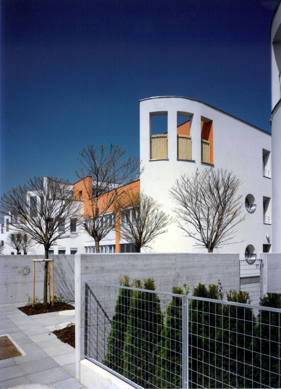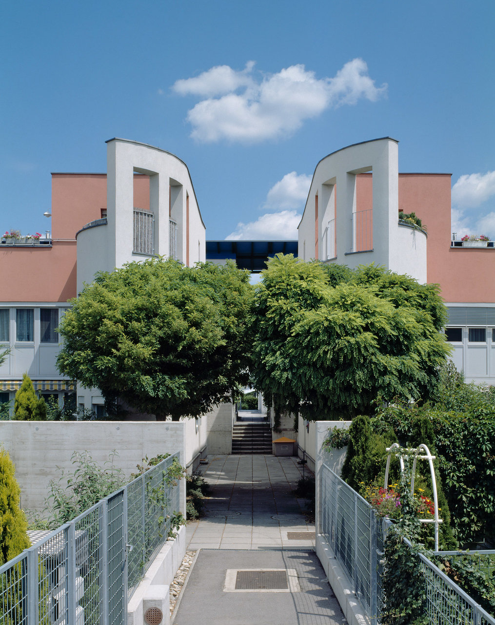 Haustyp 1: Wintergarten nach Westen, Balkon und ein französisches Fenster. Auf der großen Dachterrasse befindet sich noch ein zusätzliches kleines Studio. Haustyp 2 ist durch einen Erker, eine Terrasse und großflächige Verglasung zum Garten hin geprägt. Die Anlage ist gänzlich verkehrsfrei gehalten, die geschlossene Bebauung an der Ecke Othellogasse - Jochen Rindt-Straße schirmt die Anlage gegen ein Betriebsgebäude ab.
