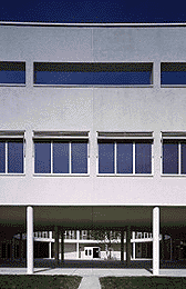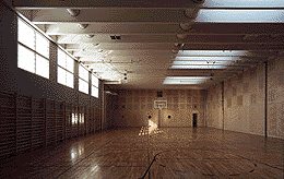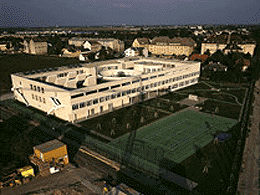 Als kompakter, dreigeschoßiger Baukörper, der alle Nutzungen einer Ganztagsschule - von den Klassenräumen bis zu den für Gäste offenen Turnsälen - aufnimmt, setzt er sich deutlich von der noch ungeprägten Umgebung ab und ist doch so dimensioniert, daß er einen städtebaulichen Anknüpfungspunkt für einen sehr homogenen Stadtteil abgibt. Es ist ein selbstbewußter, nach seinen Ansätzen in der klassisch genannten Moderne wurzelnder Bau.