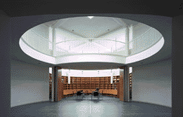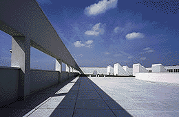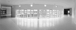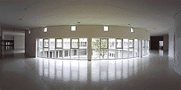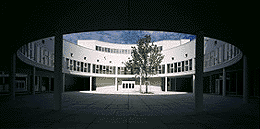 Überzeugend ist die Art, wie er die beiden Erschließungsgänge an den kreisrunden Pausenhof bindet und einen zentralen Außen- und Innenraum entste-hen läßt. Dieser zentrale Ring-raum bietet Übersichtlichkeit, Vielfalt in den Lichtqualitäten, Angemessenheit in den Materialien und Gewißheit über den ei-genen Standort, die Tageszeit, das Wetter. Nicht zuletzt ist er ein unendlicher Bewegungs-raumfür den Abbau beim Sitzen aufgestauter Schülerenergien.