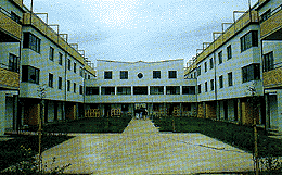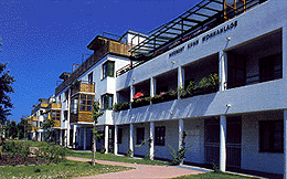 Die Glasüberdachungen sind teilweise aus verschiebbaren Elementen, was jahresbedingt entweder offene, helle Räume entstehen läßt bzw. in der kalten Jahreszeit Wintergärten schafft. Balkone, Galerien, Loggien und Erker aus Holzelementen - teilweise überdacht und mit Holzfenstern - bieten den nötigen Akzent zum Weiß des Verputzes mit seinen grünen Fensterrahmen, die in Dialog mit den Grünflächen stehen.