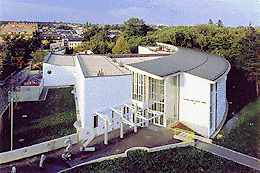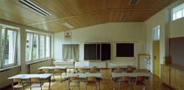 Der Schulkomplex ist in drei weiße Baukörper gegliedert und vollendet das Quartierzentrum mit Kirche, Kindergarten, Altersheim und Hauptschule. Die leicht geschwungene Eingangssituation führt vorbei an der Installation „One to Five“ von Jochen Traar in die Erschließungshalle. Dieser Krümmung folgt der Baukörper (Klassentrakt), der sich so optimal in den dahinterliegenden Baumbestand einfügt.