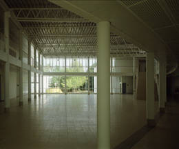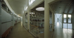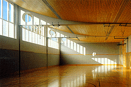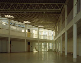 Die großzügige Erschließungshalle, fungiert gleichzeitig auch als Pausenhalle: Sie weist einen dreieckigen Grundriß auf und erstreckt sich bis ins Obergeschoss. Wegen ihrer außerordentlichen Räumlichkeit dient sie auch als Veranstaltungssaal. Treppen führen ins Obergeschoss, wo sich zweihüftig die Galerie befindet, die in die einzelnen Klassenzimmer führt. Durch ein gut durchdachtes System an Lichtquellen - Kuppeln, Oberlichten, die Hofverglasung und den Eingang - erhält die Halle ausreichend Tageslicht. Die Lichtbänder des Obergeschosses spenden ihr Licht auch den Klassenzimmern, die somit zweiseitig belichtet werden.