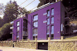 Im Erdgeschoss befinden sich Büros, in den vier Obergeschossen die Wohnungen. Das Dachgeschoß ist zurückversetzt mit rundumlaufenden Terrassen. Die Wohnungen der anderen Geschoße haben Balkone, eine Brücke bzw. Steg führt auf der Rückseite des Gebäudes vom obersten Stock zur Hangseite, wo ein Treppenweg den Berg aufwärts führt.