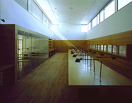 Dieser foyerartige Teil greift in den anderen Baukörper hinüber, er bildet zugleich das funktionale Gelenk zum hohen, langgezogenen Lesesaal, in dem ein langer Tisch den Raum beherrscht. Vier Arbeitskabinen stoßen erkerartig durch die Südmauer. Ihre Glasfensterwand kann mit hölzernen Schiebelamellen verschattet werden. Zwei hohe Lichtbänder ziehen sich unter der Decke den Längsseiten entlang. Zum Hinausschauen dient ein niedriger horizontaler Schlitz in Augenhöhe der Sitzenden. Auch dieser läßt sich abblenden. Der Lesesaal gibt sich introvertiert, fast meditativ in seiner Raumwirkung. Das Konzept des einen großen Tisches symbolisiert das abstrakte Gebäude gemeinsamen Forschens, gebildet aus der Summe individueller Ansätze.