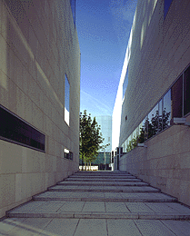 Nach außen bilden die drei Körper eine Einheit. Die Verkleidung mit weißem Kalkstein in lagerhafter Struktur deutet zwar einen subtilen Unterschied an, aber dem Vorübergehenden erscheinen die drei Baukörper als Ensemble aus einem Guß. Das gilt aber nur von außen. Während Michael Loudon, unterstützt von seinem Mitarbeiter Josef Habeler, für das Archiv eine fast klassisch anzusprechende in Schichten organisierte innere Ordnung konzipiert hat, entwickelten Karin Bily und Paul Katzberger für die Bibliothek einen gegenklassischen Diskurs mit Durchdringungen und Überlagerungen, die eine präzis vorgegebene Konstruktionsstruktur in den Hintergrund treten lassen.