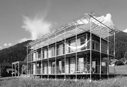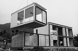 Als Heizung dient ein Mikro-Blockheizkraftwerk (5 kW), betrieben mit gebrauchtem Pflanzenöl, kombiniert mit Solarpuffer zur Wärmespeicherung; Niedertemperatur-Wandstrahler als Heizelemente. Das Grundstück wurde nicht gekauft, sondern gepachtet. Die Wohnzellen stehen auf Punktfundamenten und könnten bei Bedarf leicht „übersiedeln“. Ein Modellfall auch angesichts der überdurchschnittlich hohen Grundpreise in Vorarlberg. (Text: Otto Kapfinger in „Baukunst in Vorarlberg seit 1980, Hrsg. VAI / KUB“)