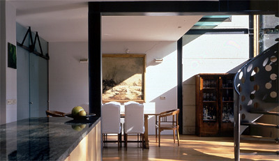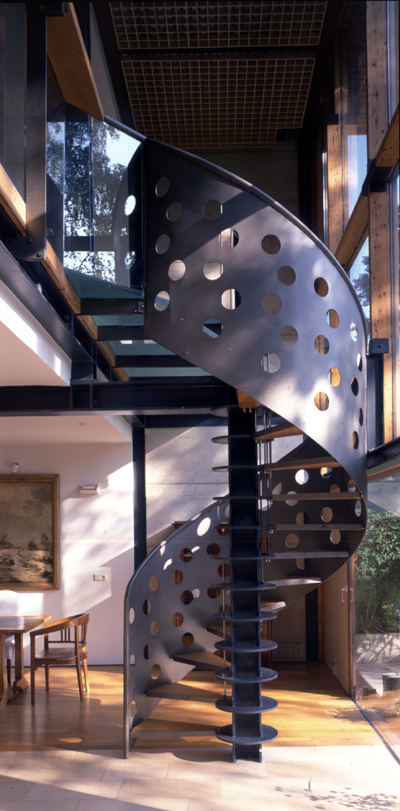 Zur Steigerung der fließenden Übergänge zwischen Innen und außen sowie zwischen Oben und Unten sind die beiden unteren Wohnebenen durch geschoßübergreifende Lufträume miteinander verbunden, darüber hinaus sorgen bewegliche Fassadenflügel, Klappen und Schiebeelemente für größtmögliche Variabilität in der Öffnung zum Garten.