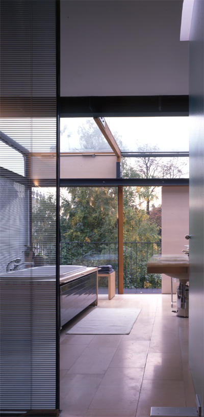 Die intensive Beziehung des Innenraums zum Außenraum findet ihren Höhepunkt in der fast zur Gänze öffenbaren Glasfront des Schlafzimmers, die den Bewohnern eine luxuriöse Variante des „Wohnens in Baumkronen“ vermittelt. (Text: Gabriele Kaiser)