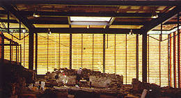 Exakt über dem Presbyterium wurde ein Oberlicht ins Dach gesetzt, wo direkter Sonneneinfall möglich ist und was in seiner Stimmung an den Lichteinfall in Kirchen erinnert.