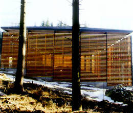 Wetschko entwarf eine Art neutraler Haube, die über die Ruine gestülpt wurde. Ein Steg im Freien führt in das Innere des Gebäudes auf eine Aussichtsplattform. Die Hauptkonstruktion ist ein Stahlgerüst mit sechs Stützen, ein weitauskragendes Dach und eine Fassade aus Lärchenholzlamellen, die sich durch die Witterung mit der Zeit grau verfärben werden.