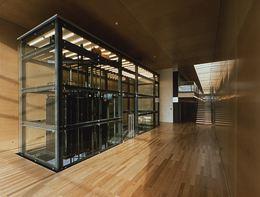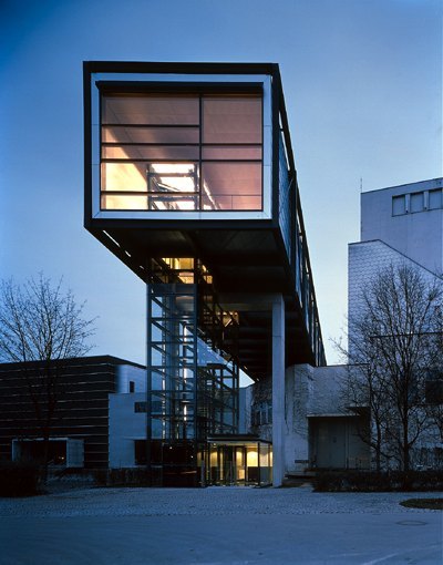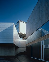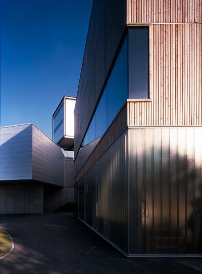 Ein Stahltragwerk - ein Vierkantriegel von 100 m Länge liegt quer über der gesamten neuen Anlage, ist Bindeglied und markanter Anziehungspunkt zugleich. Nur drei Punkte stützen diesen Baukörper im Aluminiumkleid, der in einer Höhe von 15 Metern zu schweben scheint. In diesen wurde eine zweigeschossige Holzkonstruktion eingeschoben, in der sich Büros und Aufenthaltsräume mit Blick auf den Bodensee befinden.