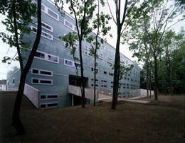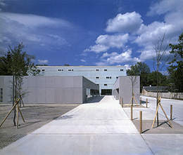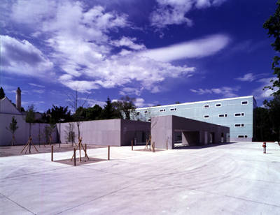 Im rechten Winkel zum Hauptgebäude steht der eingeschossige Turnsaal, parallel dazu dient ein eingeschossiger Riegel mit gleicher Länge zur externen Erschließung. Die Fassade besteht aus grossflächigen grün gefärbten Glastafeln, die je nach Lichtverhältnissen verschiedene Grüntöne erzeugen. Im Inneren setzt sich diese Material- und Farbauswahl fort und wird zusätzlich noch durch Grau- und Weißtöne ergänzt. Die Stockwerke, in denen sich die Klassenzimmer befinden, weisen eine doppelte Fensterreihe auf, eine in Sitzhöhe, die andere knapp unter der Decke für eine zugfreie natürliche Durchlüftung.