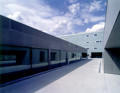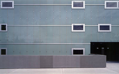 Zusätzlich weist das Gebäude aber noch transluzide Glasflächen auf, die um die Fenster herum angeordnet sind, und zusätzliches Licht in das Gebäude bringen. Bei Kunstlicht ergibt die Fassade ein interessantes Spiel von Schatten, transparenten und transluziden Bildern.