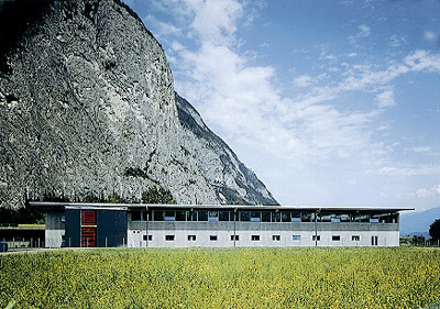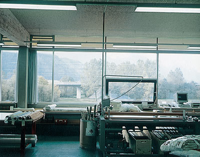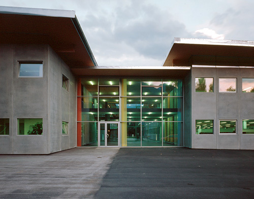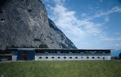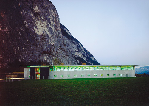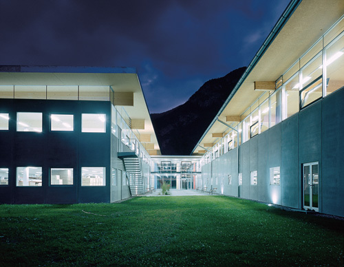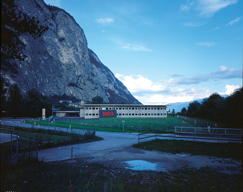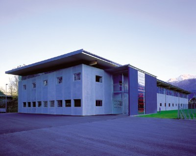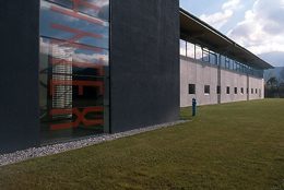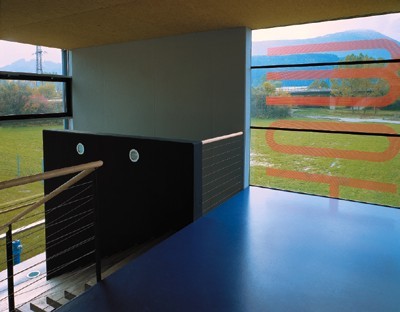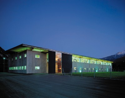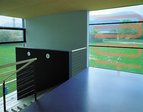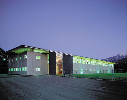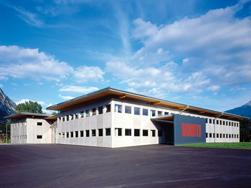 Hervorzuheben ist noch das Stiegenhaus - in bezug auf Material und Standort. Aus der Quaderform herausgerückt, erfüllt es einerseits eine signalhafte Eingangssituation, andererseits gilt es als Verbindungsglied und Andockstation für eine weitere mögliche Expandierung. Im Falle dass, wird hier weitergebaut. Farblich wurde ein graublauer Akzent gesetzt, der Ortsbeton wurde eingefärbt und auf einem der vertikalen Glasbänder läuft in großen, roten Lettern der Firmenname. Alles in allem - ein Industriebau mit hohem architektonischem Gefühl.