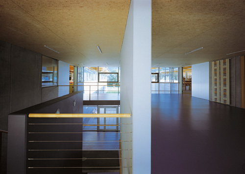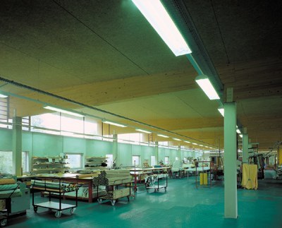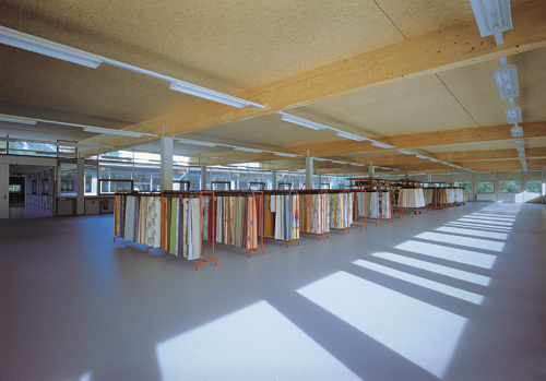 Aufwendiger gestaltet ist der Büroteil mit seinem Schauraum für Kunden - hier überwiegen Holzeinbauten. Sichtverbindung des Büros zur Produktion ist über ein breites Glasband gegeben. Das Dach, ein flach geneigtes Pultdach, wurde aus einer Leimbinderkonstruktion gefertigt mit Untersicht au OSB-Platten.