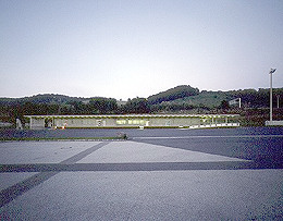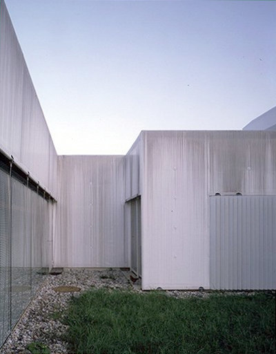 Die zuerst errichtete Veterinärstation hat ein Stahlfachwerk mit unterschiedlichen Wandpaneelen entsprechend den Funktionsbereichen. Dach und Wände sind außen fugenlos mit hochfester Folie überzogen, mit Stahlseilen nach unten abgespannt. Ohne Attikadetails und Dachrinnen konnte durch diese Innovation der Fassadenpreis auf ein Drittel des Üblichen gesenkt werden. Am Vordach der Rampe ist die Haut über die Unterseite zurückgespannt: mit integrierten Leuchten wird die Auskragung nachts zum Lichtkörper. Der Verwaltungstrakt gegenüber ist als Brücke ausgebildet, unter der ein gedeckter LKW-Park- und Abfertigungsplatz mit offener Kommunikation zum adaptierten Altbau entstand. Das Stahlfachwerk hat als Klimahülle Holz-Sandwichelemente. Auch hier ist als Außenhaut die weiße Folie über alles gespannt, der Regen aber über Innenentwässerung abgeleitet. (Text: Otto Kapfinger, 28.10.2002)