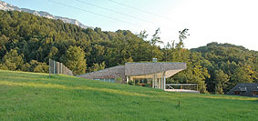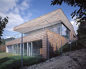 Die Integration in den umgebenden Landschaftsraum, der See und das hinter dem Haus liegende Höllengebirge waren für die Struktur des Gebäudes ausschlaggebend. So wurde ein Gebäudetyp entwickelt der vom Berg betrachtet durch das begrünte Flachdach kaum in Erscheinung tritt, sich mit den großen Glasflächen gänzlich zum See öffnet und durch die Holzschindelfassade einem der Natur entsprechenden Alterungsprozeß ausgesetzt ist. Das Haus ist zur Gänze in den Hang gegraben und öffnet sich nur mit den Eingangs - Wohnräumen und der Terrasse zum See. Der Hang setzt sich in einer Gegenläufigen Bewegung auf dem Flachdach fort. Die gesamte Konstruktion des weit auskragenden Daches ruht auf einer Beton - und zwei schlanken Stahlstützen.