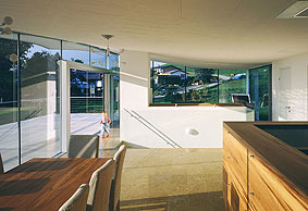 Die Statik ist so bemessen daß in der Hohlkörperform des Daches zu einem späteren Zeitpunkt ein 20 m² großes Schwimmbecken realisiert werden kann. Die Untersicht des Daches ist gekrümmt ausgeführt, somit ergeben sich im Koch-Ess - und Wohnraum unterschiedliche Raumhöhen (2.40-3.40 m)