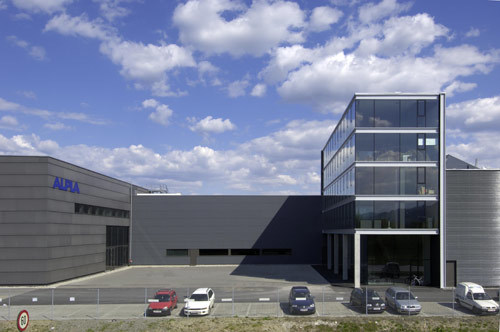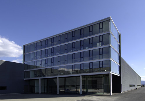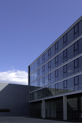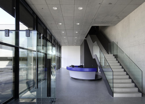 Der 18 Meter hohe Verwaltungstrakt flankiert im Kontext des Bestands einen dreiseitig umschlossenen Hof, der auf dem weitläufigen Gelände für Besucher wie Betriebsangehörige eine überschaubare Situation mit urbanen Qualitäten schafft. Im fünf Meter hohen Foyer steht eine „Himmelsstiege“ frei im Raum, eine für ein Unternehmen dieser Größenordnung angemessene Geste. Die über ein Sheddach belichtete Blaserei dockt im Süden an den Verwaltungsbau an, die Halle wird in 5 Meter Höhe von zwei mächtigen Betonröhren durchquert, auf denen die Leimbinderkonstruktion ansetzt und in welchen die Versorgungsstränge für die Blasmaschinen situiert sind; den Sandwichelementen der Fassade wurde eine transluzente Polyesterwelle vorgehängt. Den südlichen Abschluss des Werkkomplexes bildet das 27 Meter hohe, 140 Meter lange und 30 Meter breite Hochregallager für rund 5.500 Paletten mit Roh- und Fertigprodukten. (Text: Gabriele Kaiser)