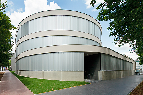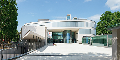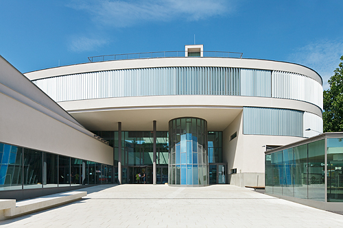 Martin Kohlbauer bedient sich bei seinen Entwürfen gerne einer Bildsprache, die auch durchaus konkret ausfallen darf, zum Beispiel in Form überdimensionierter Blumentöpfe auf Hausdächern. Für das Bildungszentrum holte sich der Architekt die Inspiration von der beschaulichen Umgebung des Bauplatzes und einer der eingemieteten Bildungseinrichtungen, der Musikschule: „Die Durchdringung von Innen und Außen war mir ein wichtiges Anliegen. Die räumlich einladende vertikale Erschließung eröffnet spannende Perspektiven und klare Orientierbarkeit. Die sinnliche, freie Komposition der Gebäudestruktur hat die Anmutung eines Instrumentes und soll sich losgelöst von der umgebenden Bebauung pavillonartig in den vorhandenen Grünraum einfügen.“
