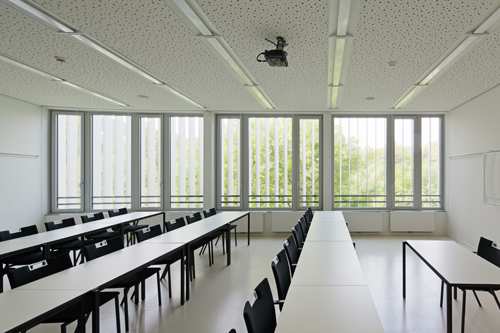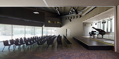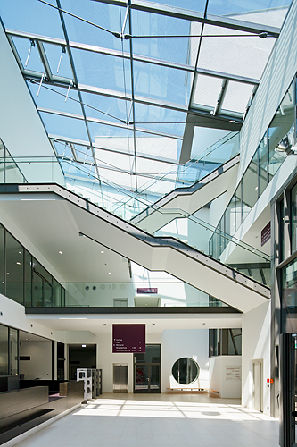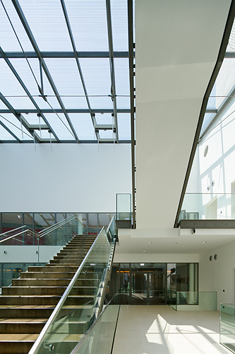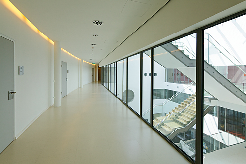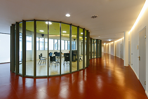 Das Raumkonzept schafft Synergien zwischen den Bildungseinrichtungen, im dreigeschossigen, glasüberdachten, atriumartigen Luftraum, der für alle Nutzungen räumlich maßgebend ist, wird das Hereinholen des Vorplatzes in die vertikale Dimension erweitert. Die Organisation des Raumprogramms auf nur drei Geschossen bringt wesentliche Vorteile; neben der räumlich einladenden, übersichtlichen, vertikalen Erschließung mit reizvollen Perspektiven ermöglicht das Gebäude eine klare Orientierung.