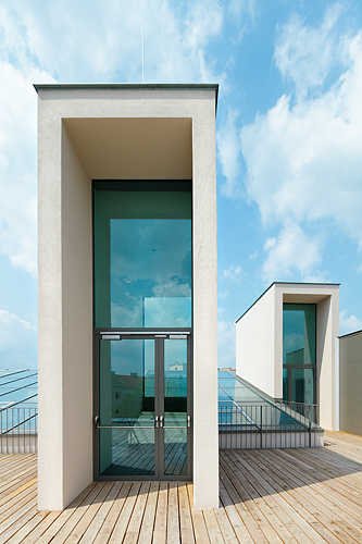 Das umweltfreundliche Gebäude ist auch ein ökologisches Vorzeigeprojekt: Mittels Erdwärme aus Erdkollektoren und Tiefenbohrung, Solarkollektoren auf dem Dach sowie kontrollierter Be- und Entlüftung werden rund 50% des Wärmebedarfs durch Alternativenergie abgedeckt; die zweite Hälfte stammt aus der Fernwärme. (Text: Architekt, redaktionell überarbeitet und erweitert Martina Frühwirth)