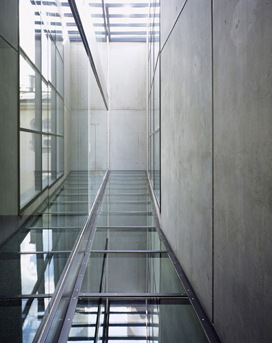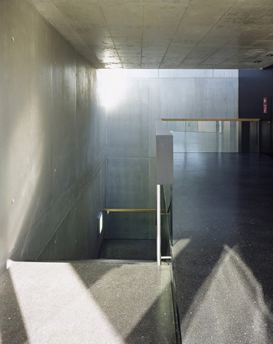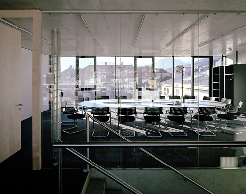Im Haus Sparkassenplatz 5 bündelt die Sparkasse im sogenannten Finanzzentrum alle Dienstleistungen der Immobilienfinanzierung und des Wohnens. Die besondere architektonische Herausforderung bestand darin, dass nur 1/3 der Hüllfläche über Belichtungsmöglichkeiten verfügt. Daraus resultiert ein komplexes inneres Raumgefüge mit der Kernidee, das Erdgeschoß bis zur Rückwand dem gleichzeitig vom Architekten neugestalteten Sparkassenplatz zuzuordnen. Die Obergeschosse orientieren sich zur Nordkette und zum Platz, die unteren Geschosse erhalten über einen gebäudehohen Lichthof zusätzlich Tageslicht.Die Gebäudestruktur aus bauteilgekühlten und vorgespannten Decken erlaubt große Flexibilität in der Bürokonzeption. Die Bürogeschosse sind zweihüftig offen, weitgehend stützenlos und mit einem zentralen Kommunikationstisch gestaltet, der die Platzrigole zitiert und temporäre Arbeitsplätze zur Verfügung stellt. Sichtbeton und helles Ahornholz bestimmen die Materialsprache des funktionalen Bürogebäudes.