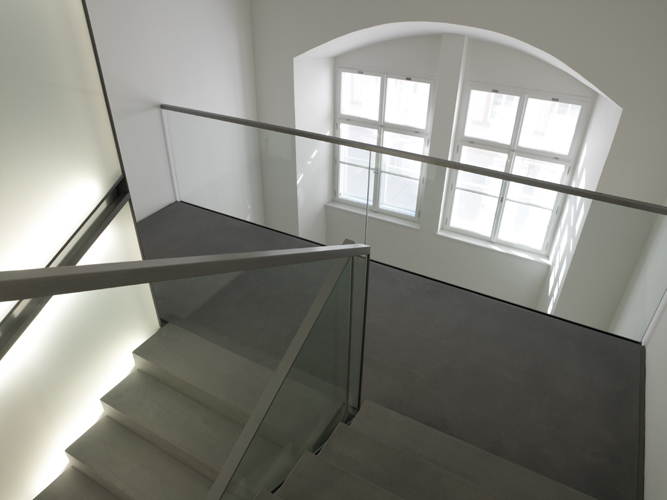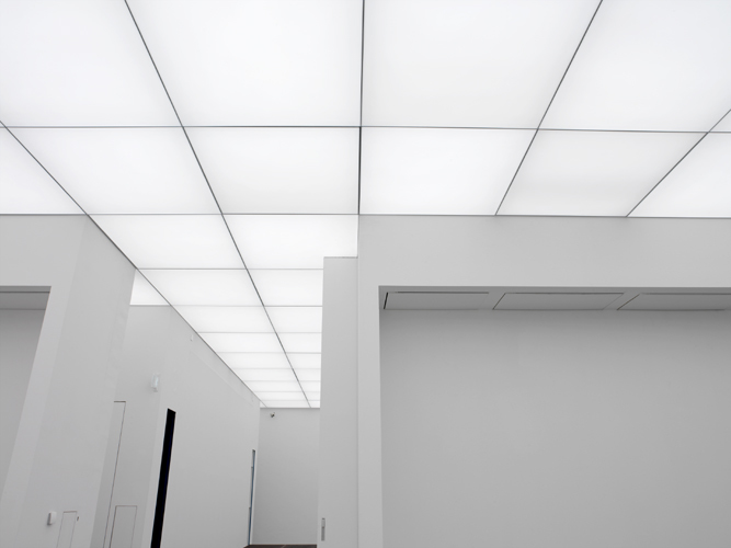 Der Gedanke, dass alle neuen Bauteile wie Sonderausstellungshalle, Stiegenhäuser samt Liften, Böden und technische Notwendigkeiten zeitgemäß in Form, Farbe, Material und Licht konsequent durchgestaltet werden, begleitete uns während der gesamten Planungs- und Bauphase. Alle Neubauteile sind vom Altbestand bewusst losgelöst, der Fußboden durch eine umlaufende Installationsrinne, die Decken in Gipskarton schweben durch indirekt angebrachtes Licht im Raum.