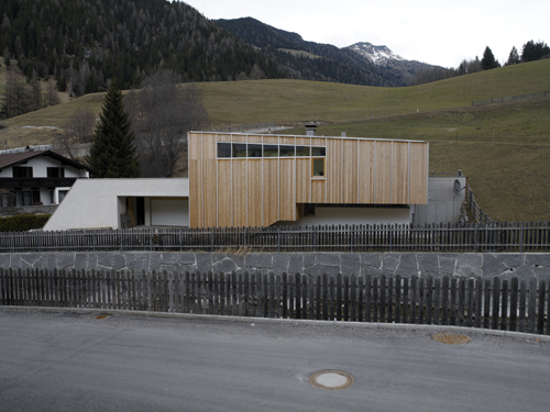 Direkt am Valserbach, am Talboden eines eng eingeschnittenen, stark verschatteten Tiroler Gebirgstals fand der Bauherr ein ungewöhnliches Grundstück. Oberhalb des Bauplatzes führt die ansteigende Landesstraße ins Tal und im weiten U wird die Eisenbahn um den Bauplatz herumgeführt. An der einzigen Stelle, wo der Horizontwinkel geringer als 10 Grad ist, steht die Autobahnbrücke von Nösslach.Die architektonische Antwort auf den Bauherrenwunsch nach einem behaglichen Eigenheim an diesem schwierigen Bauplatz besteht in einem Raumkontinuum, welches vom Eingang auf Straßenniveau über eine klimatisch geschützte Stiege in das Erdgeschoss mit Koch-, Ess- und Wohnbereich und angedockter Terrasse leitet. Die beiden privaten Rückzugsbereiche sind im Erdgeschoss untergebracht, Garage, Lagerräume, Haustechnik und Hobbyraum im Strassengeschoss. Neben der raumatmosphärischen Entscheidung dieser Lagen (Privatheit, Aussicht) liegt der Grund dafür auch in der Möglichkeit einer Überschwemmung durch den angrenzenden Bach.